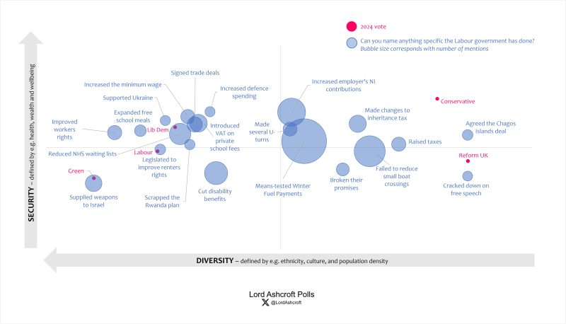 Means testing winter fuel payments continues to top the list when we ask what specific things the Labour government has done so far – indeed the top four (winter fuel, failing to stop small boats, raising employers’ National Insurance and attempting to cut disability benefits) are unchanged since last month. However, the proportion who mentioned cutting NHS waiting lists has doubled to 6 per cent.