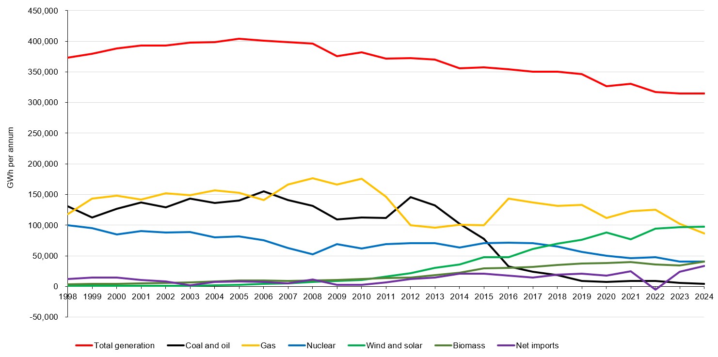 The following chart shows the amount of electricity supplied by the major categories of generators between 1998 and 2024, together with net imports via interconnectors. It also shows the total amount of electricity supplied and consumed.