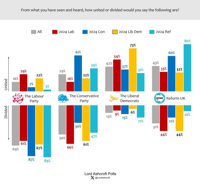 Nearly 7 in 10 voters (including 61% of 2024 Labour voters) said the Labour Party seemed divided, compared to 50 per cent who said the same of the Conservatives. Reform UK and the Lib Dems were more likely to be seen as united than divided.
