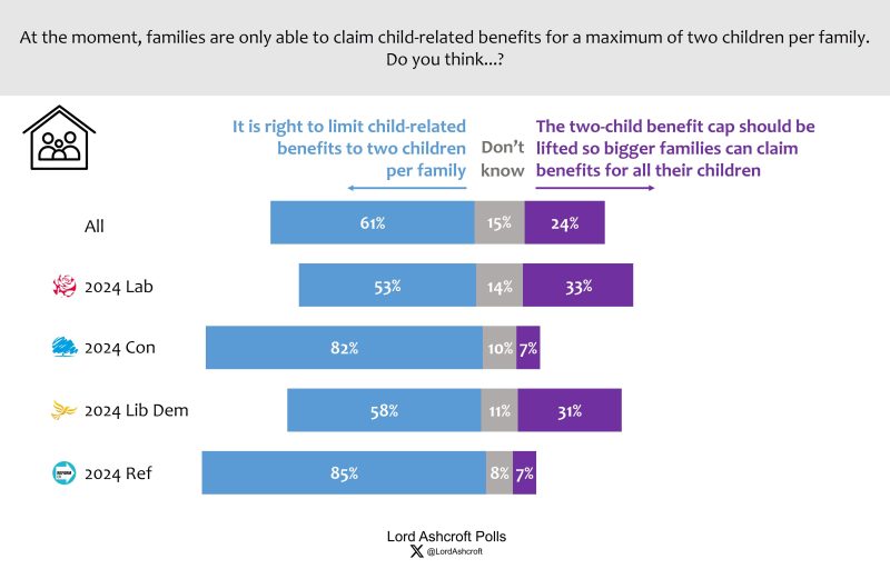 More than 6 in 10 – including majorities of all four main parties’ voters – supported the current policy of limiting child-related benefits to two children per family. Fewer than a quarter overall, and only one third of Labour voters, thought larger families should be able to claim benefits for all their children.