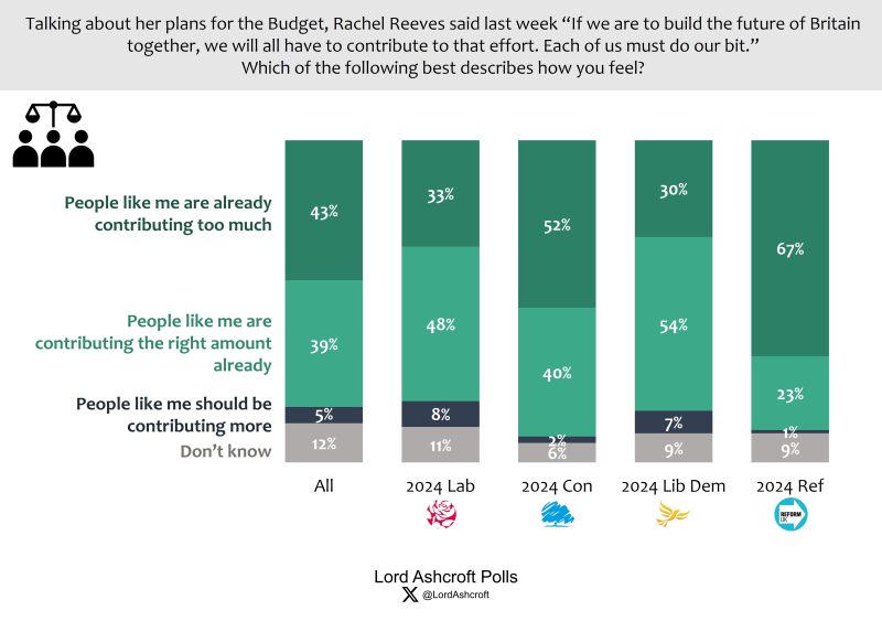 My latest poll looks at BBC bias, how the corporation should be funded, whether the parties are united or divided, and whether people would rather have a government led by Labour or Reform. And, of course, the Budget: whether we spend too much or tax too little, the two-child benefit cap, whether further tax rises are down to Labour’s decisions or factors outside its control, whether people feel they are (in the Chancellor’s words) “doing their bit”, and whether Rachel Reeves resigning would damage investors’ confidence in Britain or increase it.