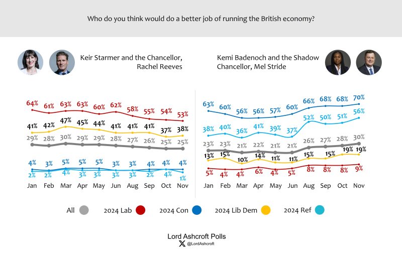 Asked who would do the better job running the economy, voters chose Kemi Badenoch and Mel Stride over Keir Starmer and Rachel Reeves by a 5-point margin, although with just under half saying, “don’t know”. Only 53 per cent of 2024 Labour voters named the Labour team; 7 in 10 Conservative voters from 2024 chose the Tory team.