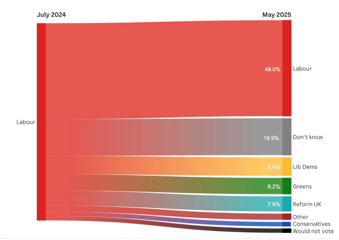 As we can see (below), the first objective was accomplished, less than twelve months into this parliament. It is equally obvious that we have made no headway with the second objective. Disillusioned Labour votes are going everywhere, except to us.
