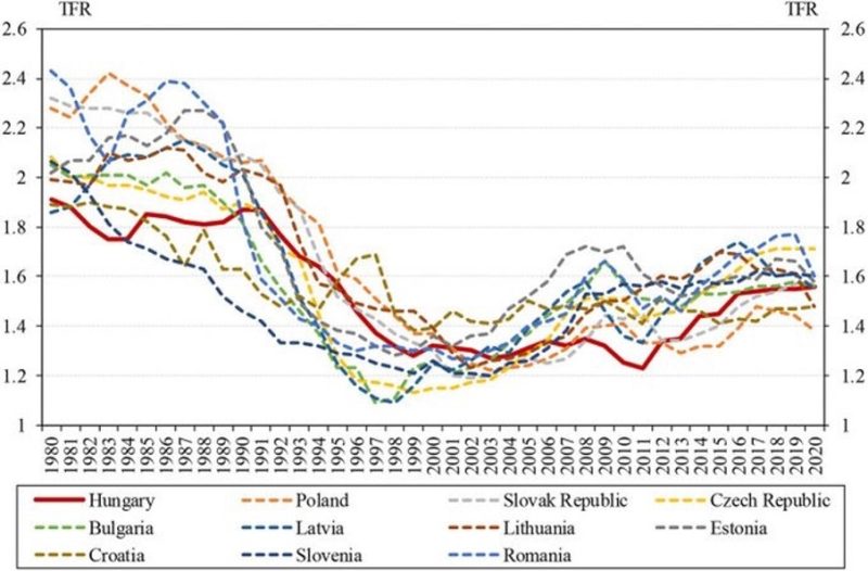 Fertility has risen certainly, but it has risen exactly in line with the region as a whole. In 1990 it had the median fertility of Central & Eastern Europe and today it has… the median fertility of Central & Eastern Europe. National-conservative Hungary has a fertility trend that is functionally interchangeable with that of market-liberal Estonia or social-liberal Slovenia.