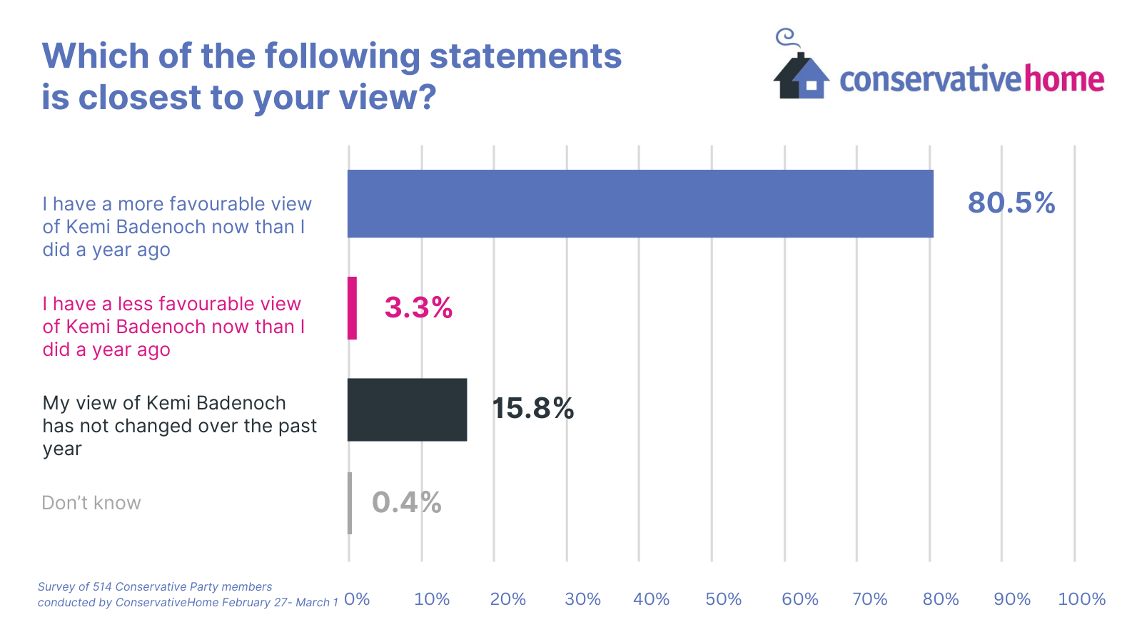 It is no secret that Kemi Badenoch didn’t have the easiest start to her time at the Tory helm. So much so that in our own ConHome survey, polling party members, the people who had elected her, she once ended up on a flat zero. The people were not satisfied.