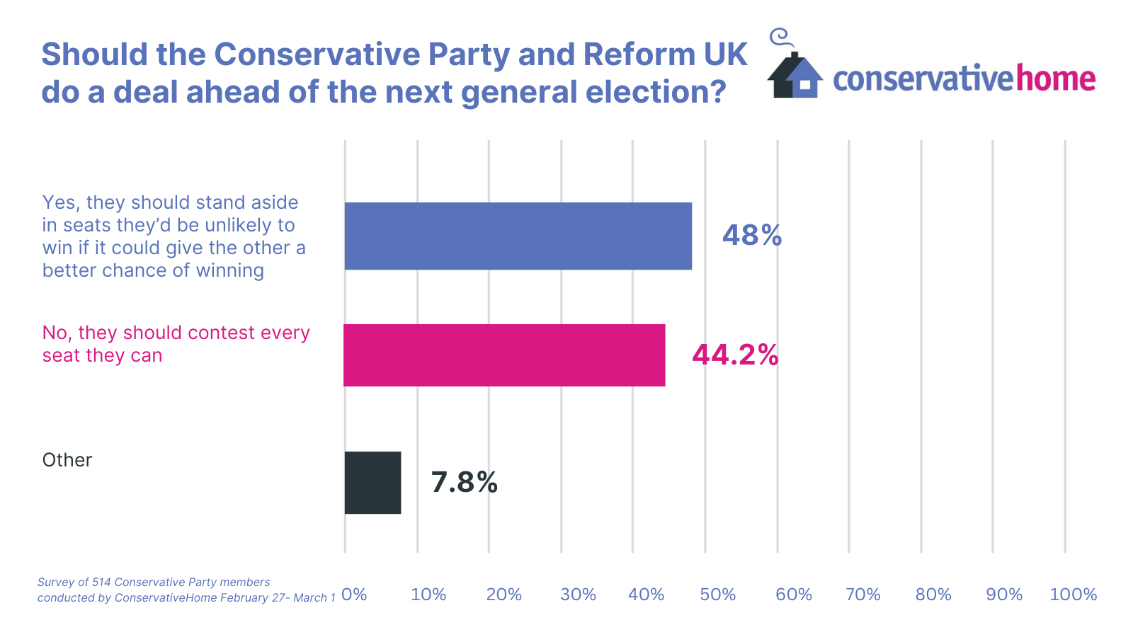 At least Badenoch’s denials will be reassuring to the 44.2 per cent of our survey who don’t want to see a deal and would like to see the party contest every seat they can.