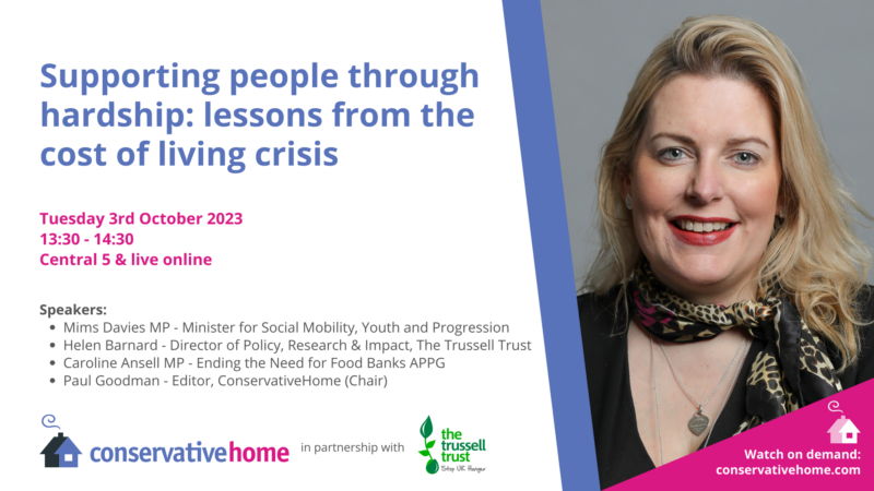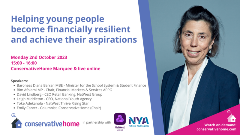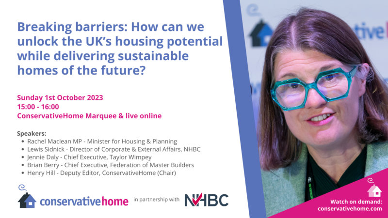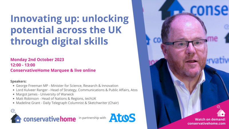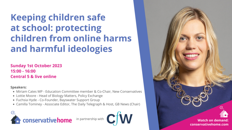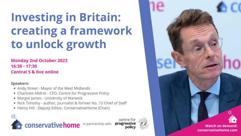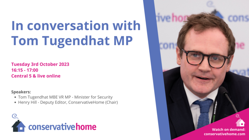 Each of our events will be taking place in-person in either the ConservativeHome Marquee or Central 5 in Manchester Central. All of our events will also be available to watch live and on-demand online for free via ConservativeHome’s YouTube channel. Just click the relevant graphic below and it will open the YouTube stream in a new window (live at the relevant time, or on demand afterwards).